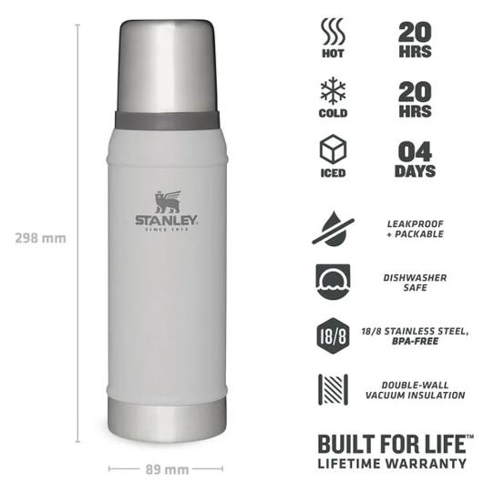 Paslanmaz çelik vakumlu yalıtımın en tepe noktası, çift duvarlı 750 ml hacimli Stanley Classic termos sıcak veya soğuk içecekleri 20 saate kadar, buzlu içecekleri de 4 güne kadar korur. 18/8 paslanmaz çelik ve BPA'sız malzemelerle üretilmiştir, sızıntı yapmaz, paslanmaz, kapağı bardak olarak kullanılabilir, ömür boyu garantilidir ve sizi asla yarı yolda bırakmaz.