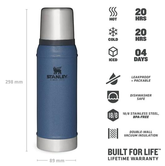 Paslanmaz çelik vakumlu yalıtımın en tepe noktası, çift duvarlı 750 ml hacimli Stanley Classic termos sıcak veya soğuk içecekleri 20 saate kadar, buzlu içecekleri de 4 güne kadar korur. 18/8 paslanmaz çelik ve BPA'sız malzemelerle üretilmiştir, sızıntı yapmaz, paslanmaz, kapağı bardak olarak kullanılabilir, ömür boyu garantilidir ve sizi asla yarı yolda bırakmaz.